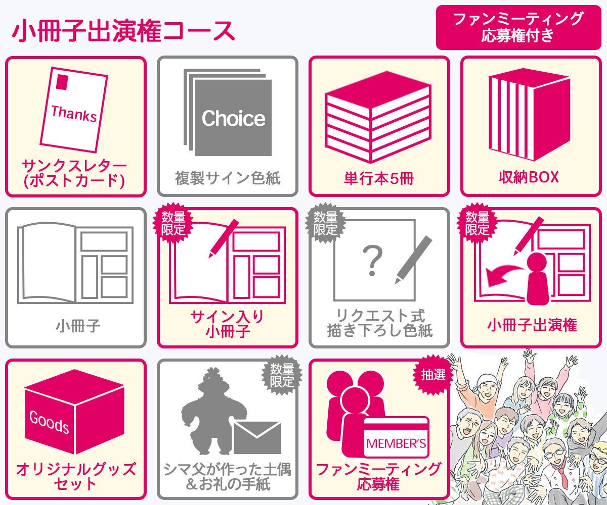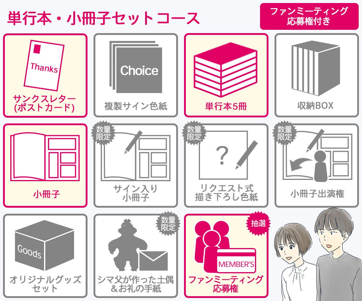 今回、様々なリターンをご用意させていただきましたが、とにかく単行本と小冊子が欲しい!という方には、<単行本・小冊子セットコース>、合わせてグッズも欲しい!という方には<オリジナルグッズセットコース>がおすすめです。バラでご支援いただくよりも2,000~3,000円お得な設定となっております。