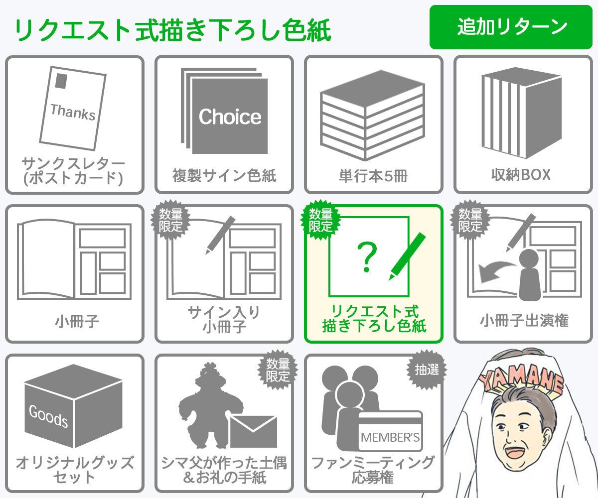 メインとなるのは単行本と小冊子になりますが、様々なグッズや描き下ろしリターンもご用意しております。数量限定のリターンはほぼ在庫切れとなってしまいましたが、下記のリターンはまだお申込みいただけますので、ぜひご検討ください。