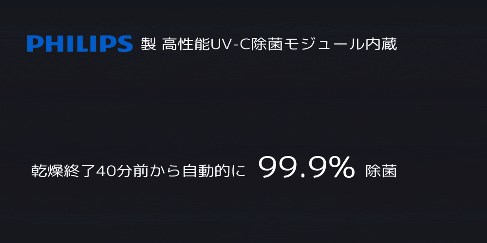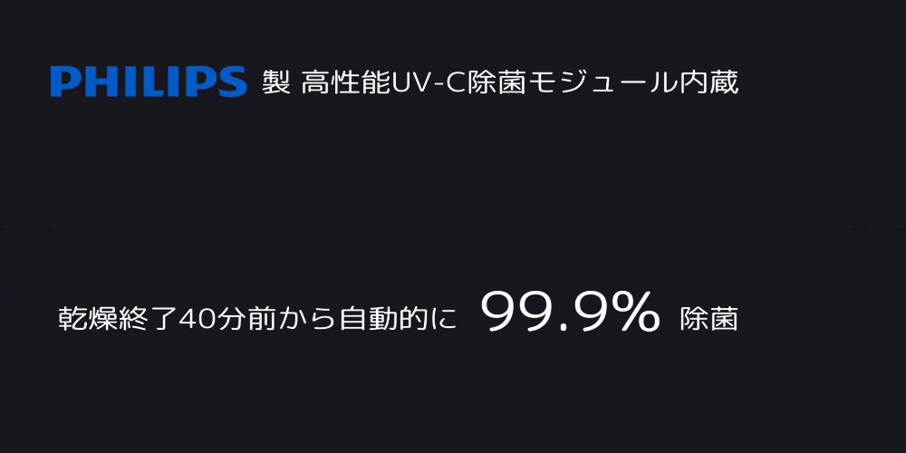 機能の要となる除菌モジュールには、医療機器メーカーとして世界のヘルステック分野の最先端を走るPHILIPS製の高性能UV-C除菌モジュールを内蔵。乾燥が終わる40分前から自動で除菌を開始します。(40分以下の乾燥時間の場合は、乾燥と同時に除菌開始します)