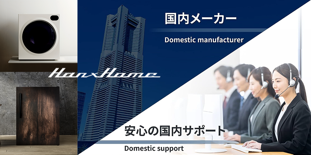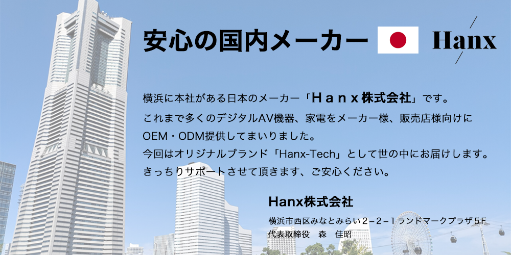 Hanx株式会社は、大手家電メーカーでモノづくりを20年以上経験したメンバーが集まり設立した横浜に本社があるデザイン家電メーカーです。埼玉県にサポートセンターがあり、経験豊かな日本人スタッフが丁寧に心を込めてご対応させて頂きます。もちろんお手元に届いてから1年間無償保証付きです。