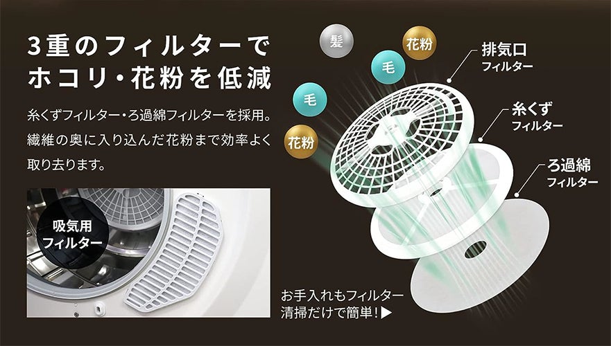糸くずフィルター・ろ過綿フィルターを採用。繊維の奥まで入り込んだ花粉まで効率よく取り去ります。フィルターを清掃しても汚れが残るようでしたらオプションのフィルターと交換して下さい。