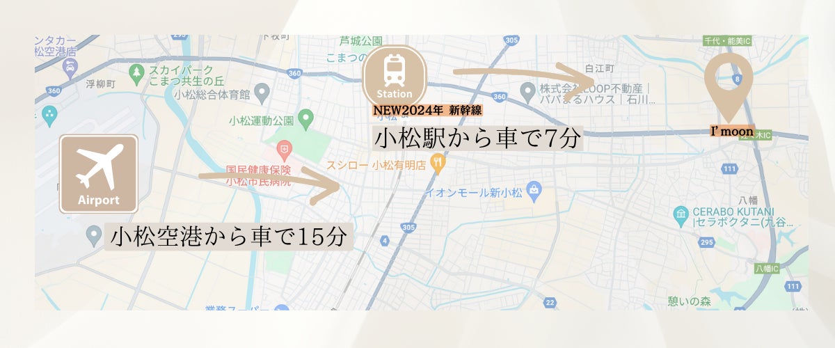 小松空港からI'moonまで車で「約15分」