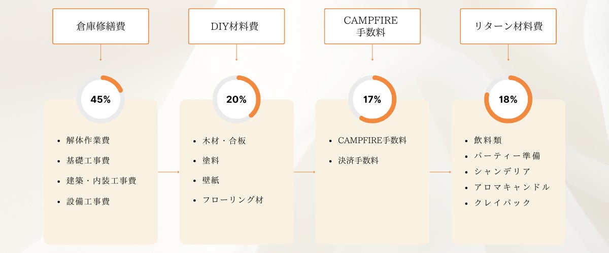 目標額 150万円の内訳は、クラウドファンディング手数料、リターン品の制作・配布費用、そして倉庫のリノベーション及び