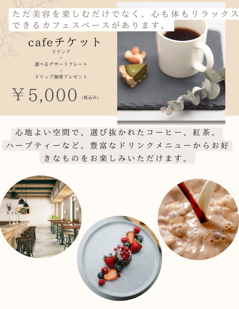 現在は、脱毛、フェイシャルケア、ボディケア、整体、ヘッドスパなど様々な専門技術を持つスタッフが施術を行なっております。内から健康も求め専門家と共同開発したオリジナル薬膳茶などの商品も取り扱いしております。
