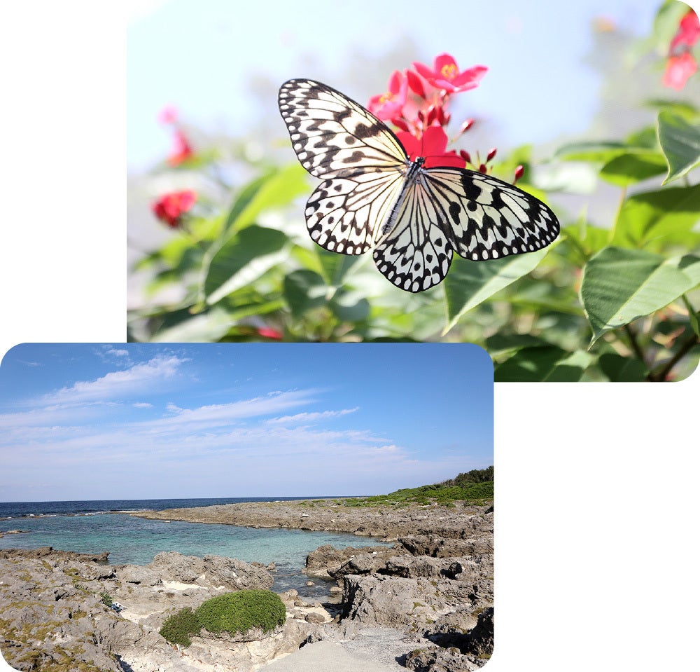 そんな島には、様々な生き物が生息しており、緑豊かな大地では、季節問わず蝶が舞い、南の島の貴婦人と呼ばれる「オオゴマダラ」や、渡り蝶として有名な「アサギマダラ」が人々の目を楽しませてくれます。