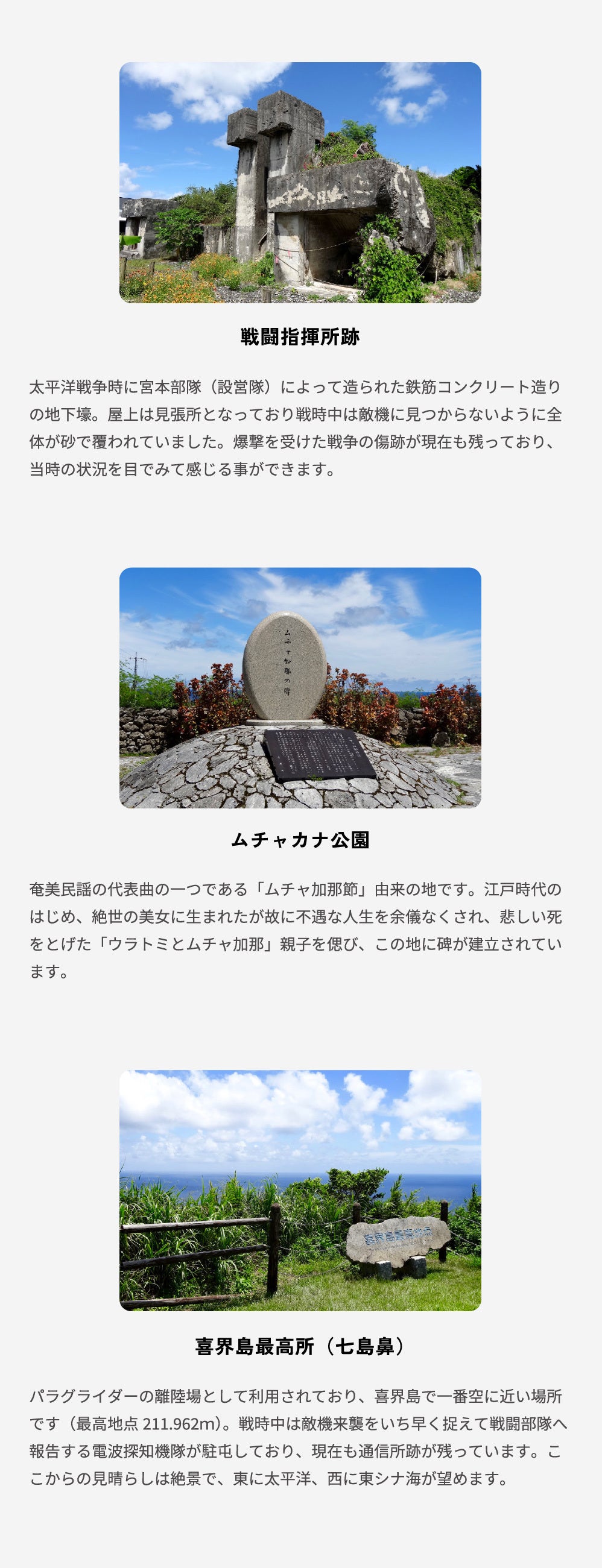 島内に150ヶ所ほど存在する遺跡からは縄文時代から続く人々の営みを垣間見ることができ、源氏や平家にまつわる史跡、琉球王国や薩摩藩からの影響、そして太平洋戦争の爪痕や米軍統治時代など、歴史の荒波に揉まれながらも、喜界島の人々が逞しく生きてきた、そんな島の歴史が各所で感じられます。