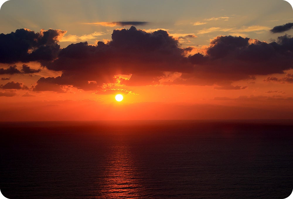 「朝日酒造」の名は、喜界島が奄美群島のなかで最も東に位置し、どの島よりも早く朝日を見られることに由来しています。エメラルドグリーンに輝く海から昇る朝日は、朝日酒造、そして喜界島の全ての島民にとって大切な風景です。