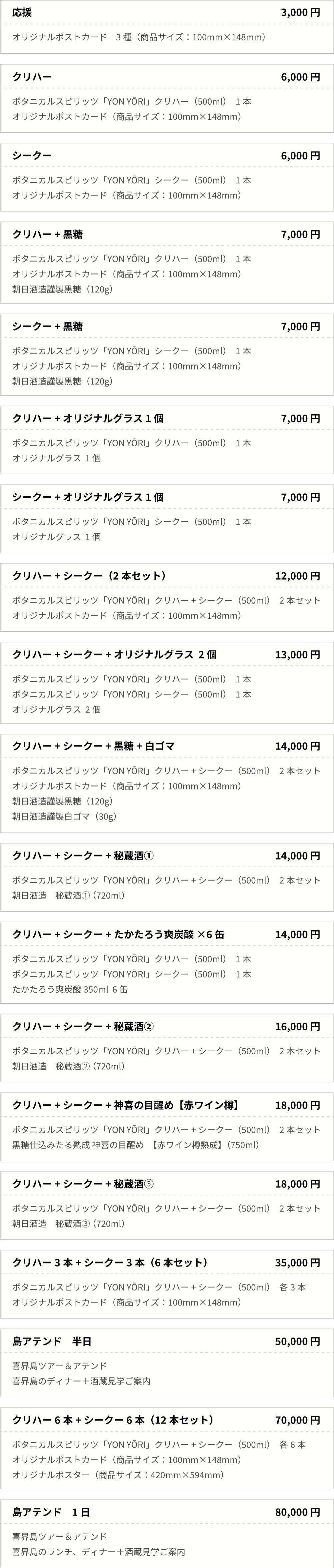 2024/12/04 17:14皆さま、こんにちは!題して、『喜界島を旅するスピリッツ』。「YON YŌRI(よんよ~り)」をご支援いただきまして、ありがとうございます!プロジェクト終了まで残り4日となる中で、改めてたくさんのご支援、まことにありがとうございます!お蔭様で現在の達成率は150%を超えております。今回、限られた予算の中で、これまでに私たち朝日酒造をご愛顧いただいた方を中心に、喜界島をより深く知っていただくプロジェクトとしてご案内させていただきました。そういった中でも、これまでのお客様はもちろん、新しく私たちに興味を持っていただいた方からも多くのご支援をいただいており、感激しております!喜界島の雰囲気をより感じていただけるよう、「YON YŌRI(よんよ~り)」を現在鋭意準備中でございます。12月中に皆様のもとへお届けできるよう、準備を急いでいますので、またこちらにて状況報告させていただきます!「YONYORI応援隊」についても、引き続き募集しております!クラウドファンディング終了後もご利用いただけるポスター&ポストカードになります。ポストカードは30枚単位、ポスターは5枚単位でお届けしますので、「ぜひ応援したい!」という方は「メッセージを送る」ボタンよりご連絡先(住所、お名前、電話番号)と用途(置いていただける場所)を添えてご一報ください。応援隊の方には、上記販促アイテムを無料で差し上げます! もっと見る