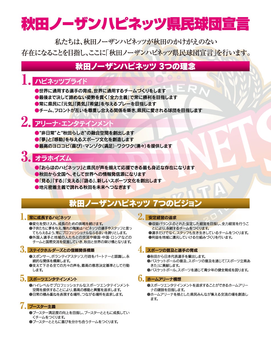 私たちは秋田に永続するクラブを目指す決意として2011年10月15日に「秋田ノーザンハピネッツ県民球団宣言」を掲げました。