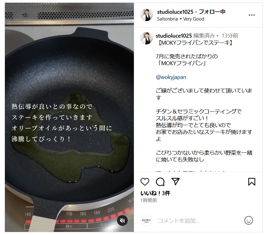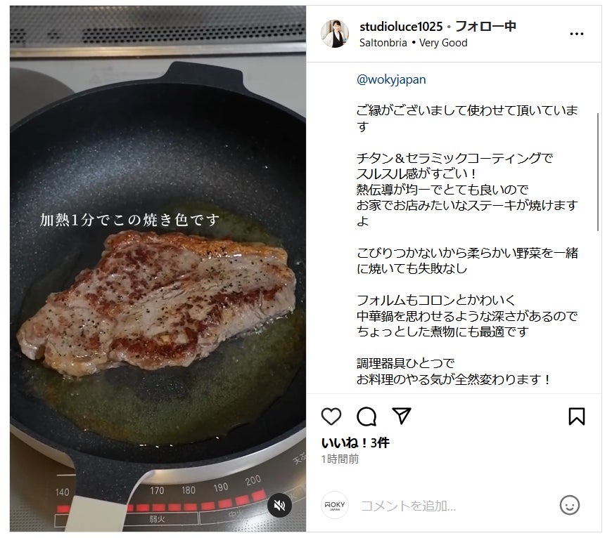 原田先生にはシンプルだけど意外と失敗しやすい「ステーキ」を焼いていただき、感想をご自身のInstagramにいただきました。