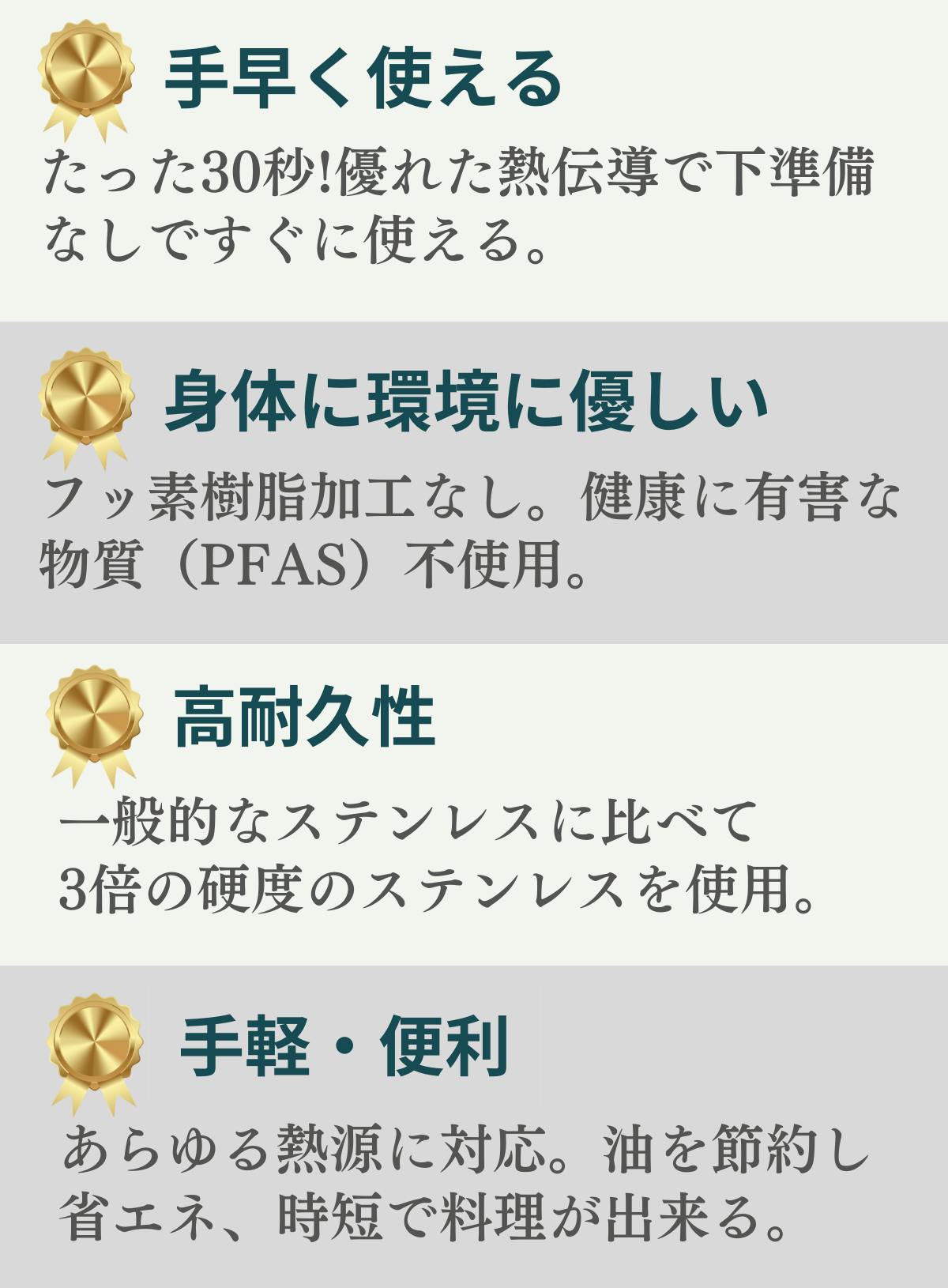 フッ素樹脂など健康に懸念が指摘されている有害物質(PFAS)も一切不使用なので安心してご使用いただけます。