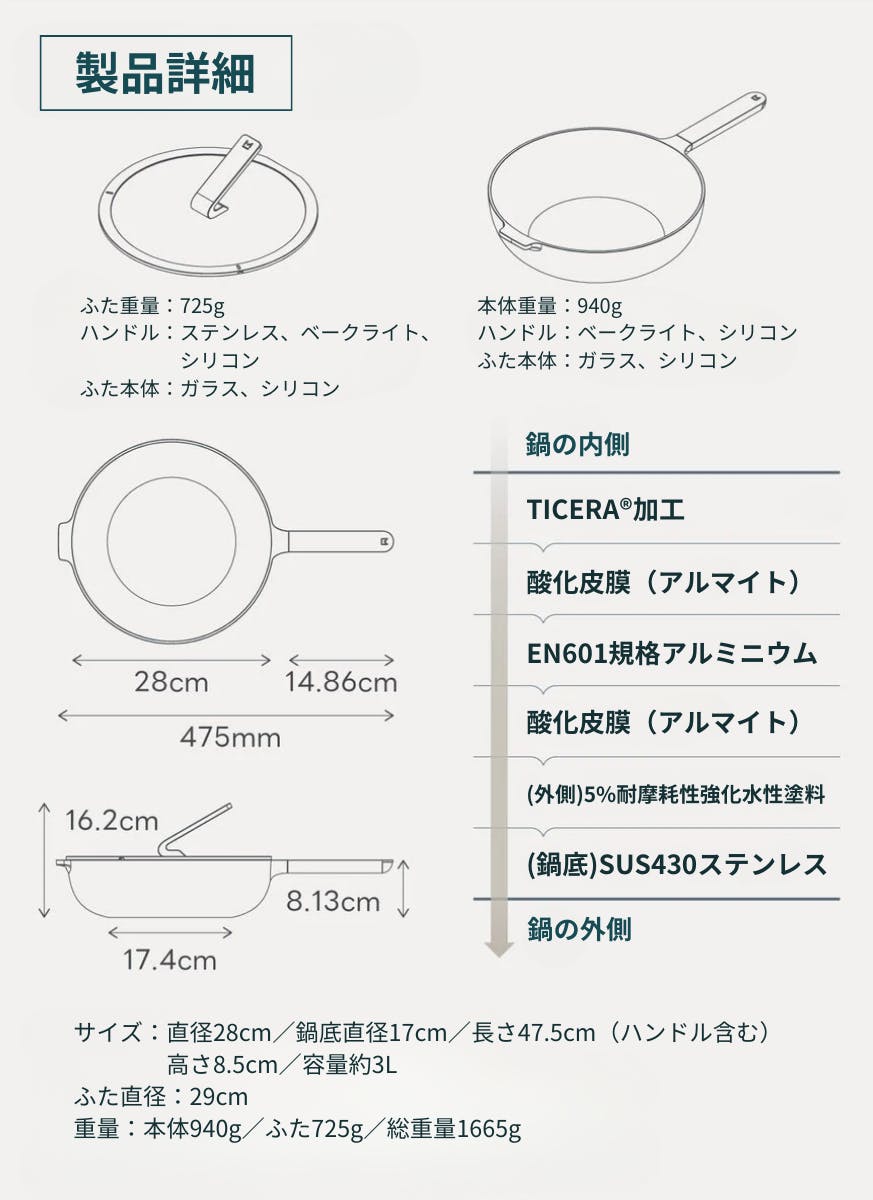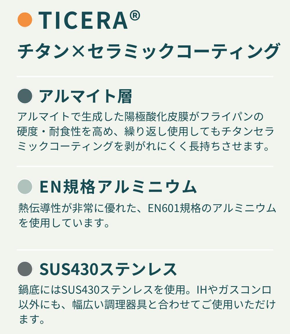 独自開発された安全性の高い「TICERA®」チタン×セラミックコーティング×アルマイトはキズに強く、耐久性も従来品と比べ格段にアップ。