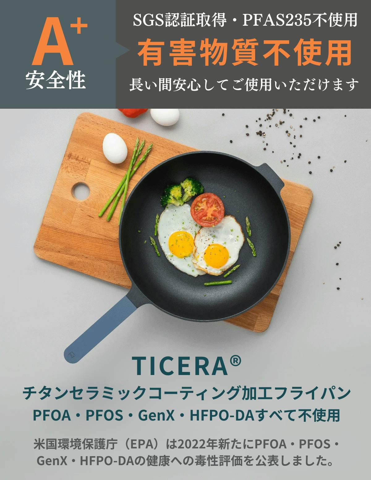 WOKYのフライパンシリーズはPFOA・PFOS・GenX・HFPO-DAなどの健康に有害な物質(PFAS)を一切使用していません。