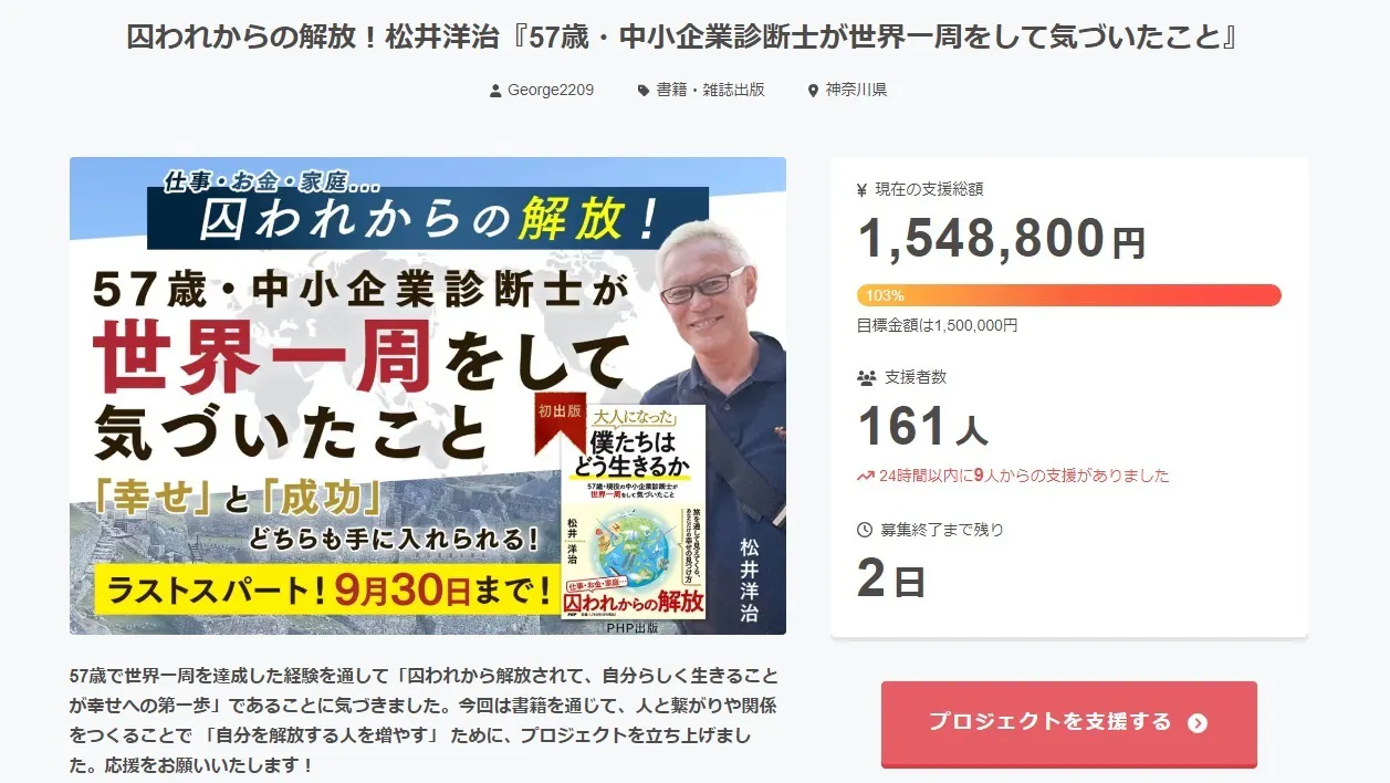 2024/09/28 07:39皆様のご支援のもとおかげ様で遂に残り2日あと9万円で150万円達成、48名で200名!!になりました。ご支援お待ちしております。紀伊國屋 新宿本店ではビジネス2位を頂きサイネージで流れていました。お求め頂きました本の発送やお会いする日程調整は9/30以降随時ご連絡させてください。 もっと見る