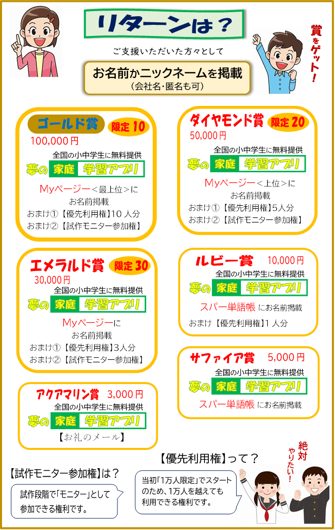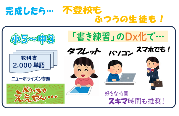 不登校は「学力の回復」に使ってもらい、ふつうの生徒は「学力アップ」に利用と、全国500万人の小中学生に無料で提供します。