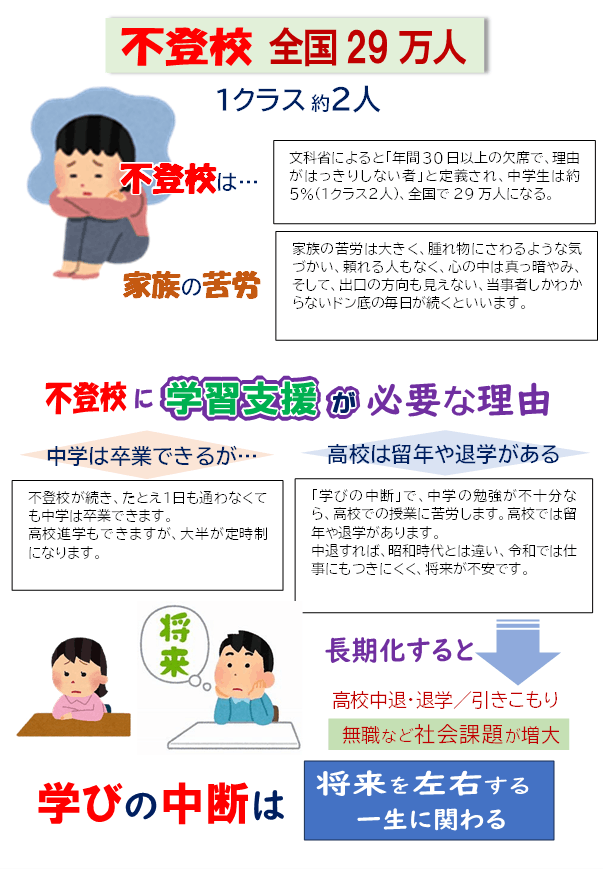 もちろん、体調が優先ですが、「学びの中断」が長期化すると学力が遅れ、大事な人生まで左右してしまうなどの危惧から、「学習支援」を決意したのです。