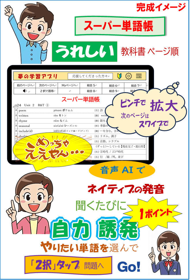 暗いイメージの覚え込み勉強を「タップでサクサク」できたら、もっと「学び」が楽しくなりますね。子どもたちの笑顔が目に浮かびます。