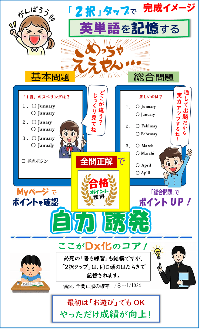 そこから、<タップで記憶>するアプリの開発が前進しました。すると、ある方から、「書き練習」のデジタル化として画期的だとのご指摘があり、短時間でスペリングがマスターできる新技術(Dx化)にもなりました。