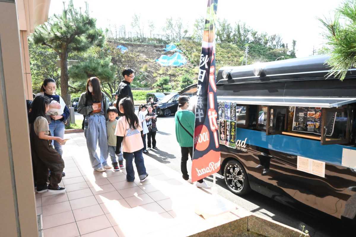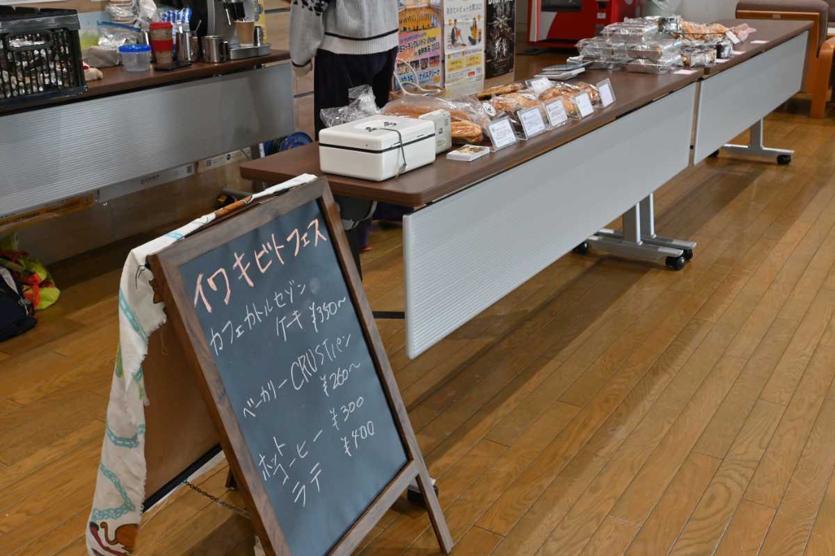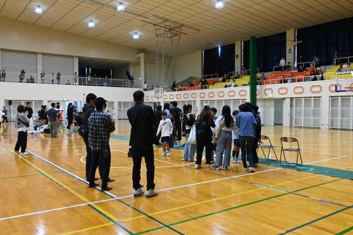 会場となる岩城総合体育館は、バスケコート2面分の広さがあり、ふらっと立ち寄って見ていくことができる気軽さがあります。物品販売やキッチンカーの出店もあります。