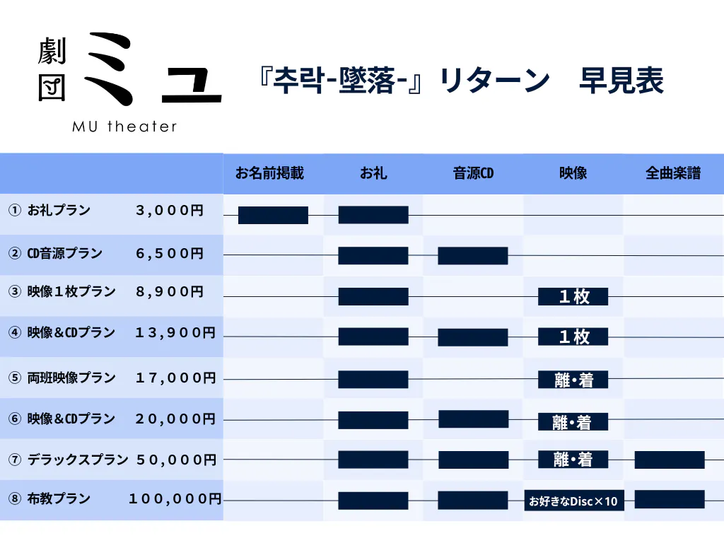 わたしたち【劇団ミュ】と今作キャスト・スタッフ一同は、このプロジェクトを通じて、より多くの人々にミュージカルの感動を届けたいと心から願っております。皆さまのご支援で、このBlu-ray・DVD・CDの制作が実現し、より多くの方々に私たちの作品を、引いては日本オリジナルのミュージカルを楽しんでいただけることを願っております。どうか何卒お力添えいただき、この夢を一緒に実現していただければ幸いです。ご支援、どうぞよろしくお願い申し上げます!