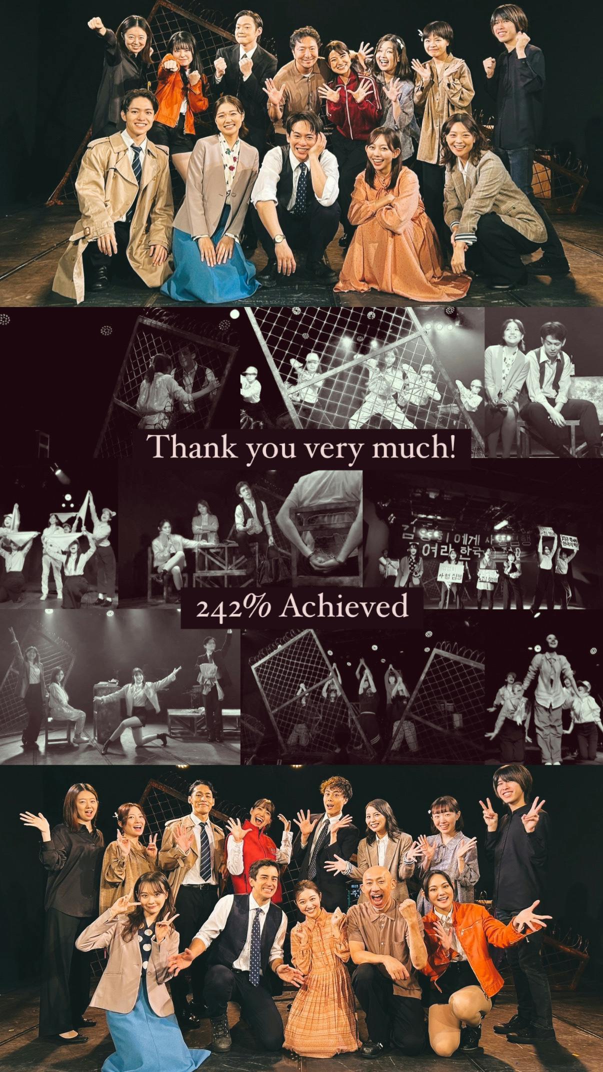 2024/11/20 23:26昨夜、11月19日をもちまして『추락-墜落-』のクラウドファンディングも無事に幕を閉じました。結果はなんと、、、目標達成率驚異の242%!!!!!161名の方よりご支援いただき、総支援額2,423,400円という初めてのクラファン挑戦にして素晴らしき結果を収めることができました。劇場へ足を運んでくださった方、遠くから応援してくださった方、クラファンをあたたかく見守ってくださった方、ご支援し、声を広めてくださった方、『추락-墜落-』に関わってくださったすべての皆さまに心からの感謝を申し上げます。本当に本当にありがとうございました!!!現在リターンの準備を進めております。本作は、早着替えや、20以上の場面転換、小道具を使った華麗なダンスや、魂のこもったナンバーの数々など、見どころがたくさん!!そんなキャスト・スタッフ全員の努力の結晶がギュッと詰まった宝箱のようなCD・DVD/Blu-ray、ぜひ到着を楽しみにしていただければと思います。見れば見るほど新たな発見があるはずです!!今回こうして、クラウドファウンディングを通じて、劇場の枠を飛び出しもっともっと多くの皆さまと繋がることができました。それは、小劇場にて公演を重ねるまだ小さな劇団ミュにとって、とてもとても大きな夢でした。そんな大きな夢が叶ったのは、皆さまのご支援のおかげです。Op.1の『Liebe』で数多くの円盤化希望のお声をいただき、お客様の声がダイレクトに届いたことで実現した円盤化クラウドファウンディング。改めて、本当にありがとうございます。来る春、3月のOp.3『初恋』の足音が近づいてきております....!これからも、劇団ミュは皆さまの応援の声を胸に、心に響く作品をお届けしてまいりますので、引き続きSNSなどの更新を見ていただけましたら幸いです。劇団ミュを末長くどうぞよろしくお願いいたします! もっと見る