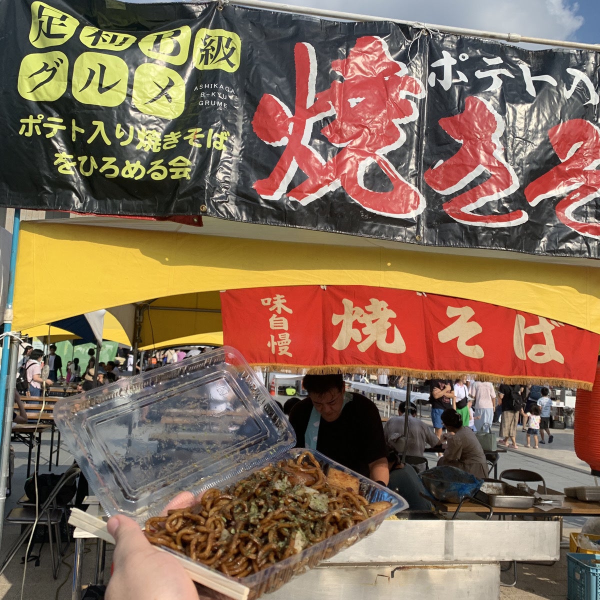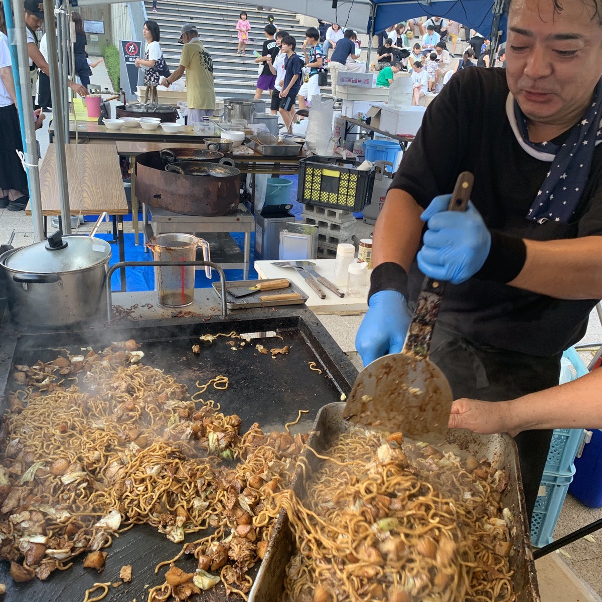 (▲2023年9月、宇都宮ライトキューブ前広場で行われた「カミナリまつり」でポテト入り焼きそばを焼いて販売する長沼)