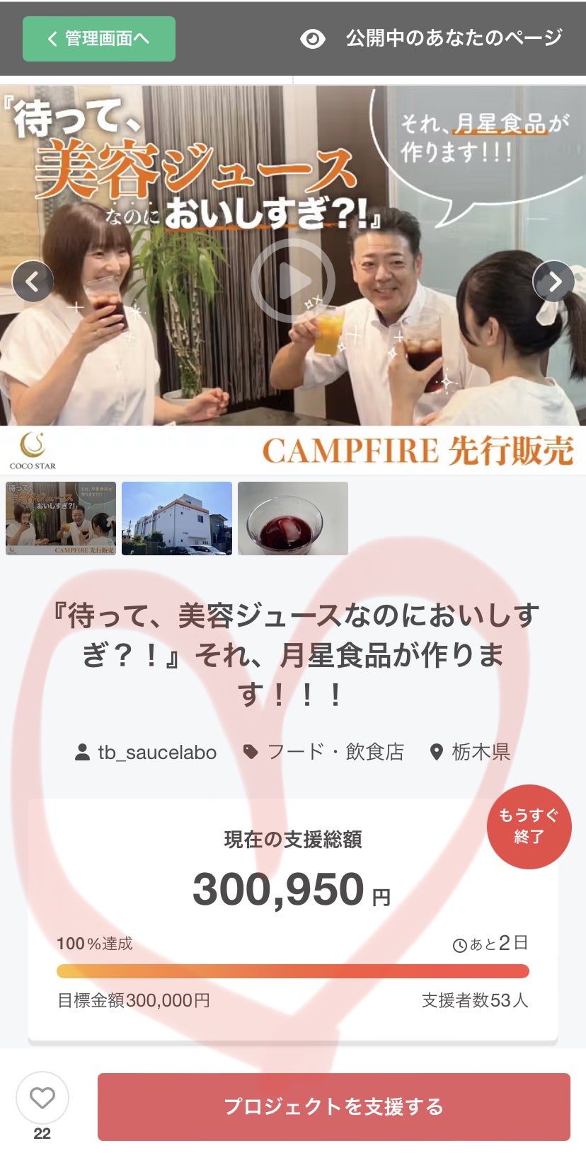 2024/08/08 11:55こんにちは!月星食品です。ついにプロジェクトがスタートしました!さっそくご支援いただいた皆さま、本当にありがとうございます!!実は水面下で数カ月準備を進めていましたが…「ソース屋の美容ジュースなんて理解を得られるはずがない」「今度こそ絶対無理でしょ…」そんな声もある中、頭をひねり、汗水垂らしてプロジェクトページを作りました。初日の拡散数とご支援数が非常に重要とのことで…皆さまぜひ、拡散・応援のほどよろしくお願いいたします! もっと見る