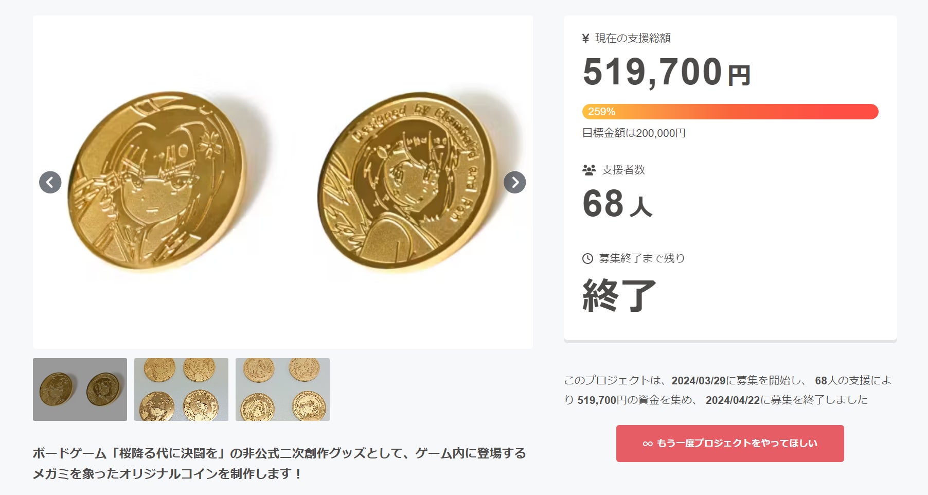 そのコイン好きが高じて、2024年の春には「推しボードゲーム『桜降る代に決闘を』の非公式二次創作グッズとして、オリジナルデザインのコインを作成する」というクラウドファンディングを実施しました。