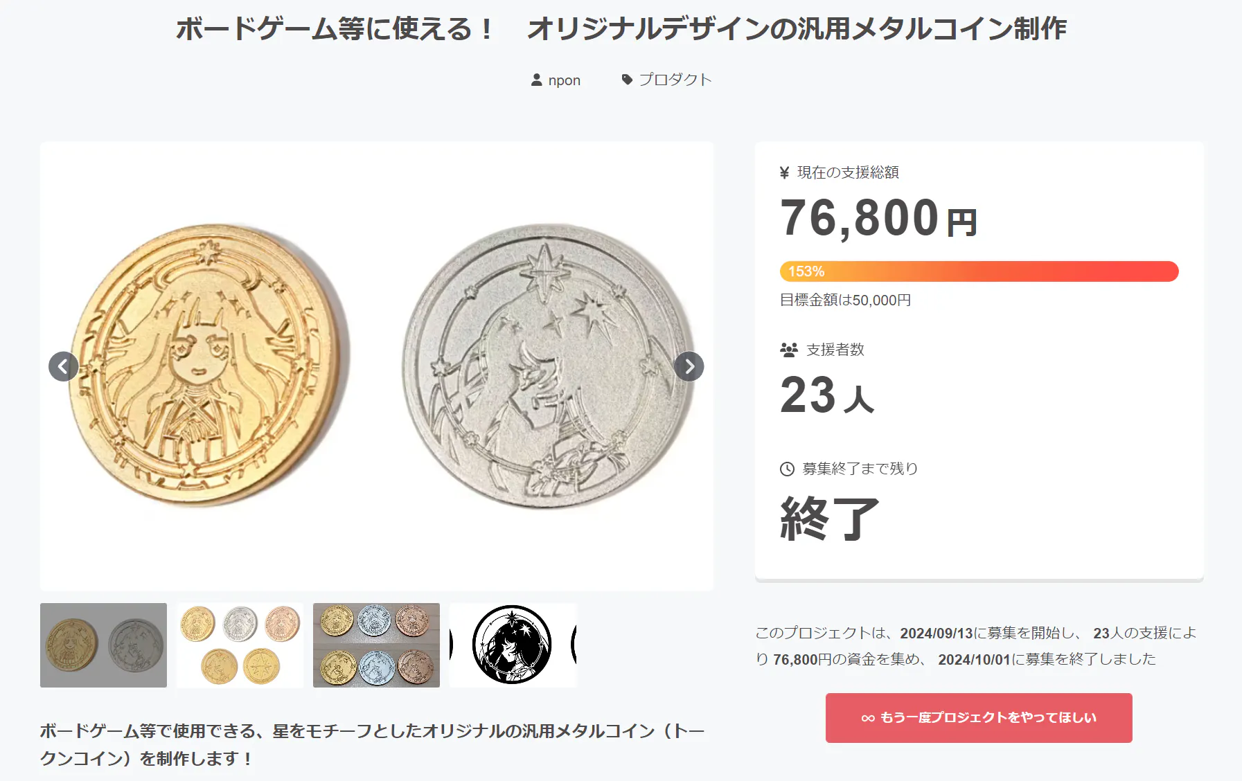 私と同じように、このコインのデザインを気に入っていただける方、そして「このコインが欲しい!」と感じていただける方がいらっしゃいましたら、ぜひご支援いただけると幸いです。
