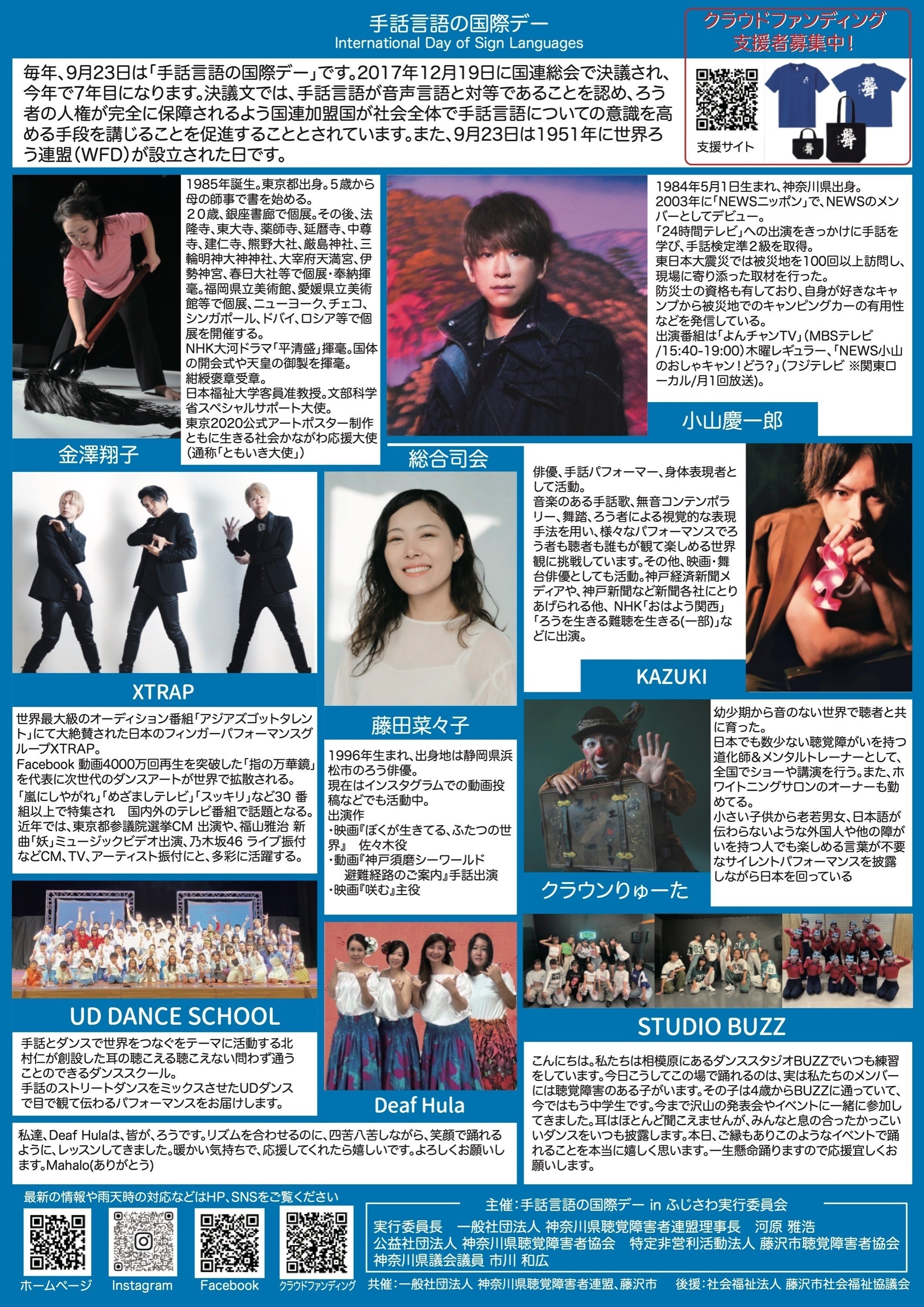 私たちは、神奈川県及び藤沢市の聴覚障害者の当事者団体である、「神奈川県聴覚障害者連盟」と、「藤沢市聴覚障害者協会」の代表者とその仲間で結成された「手話言語の国際デーinふじさわ実行委員会」です。