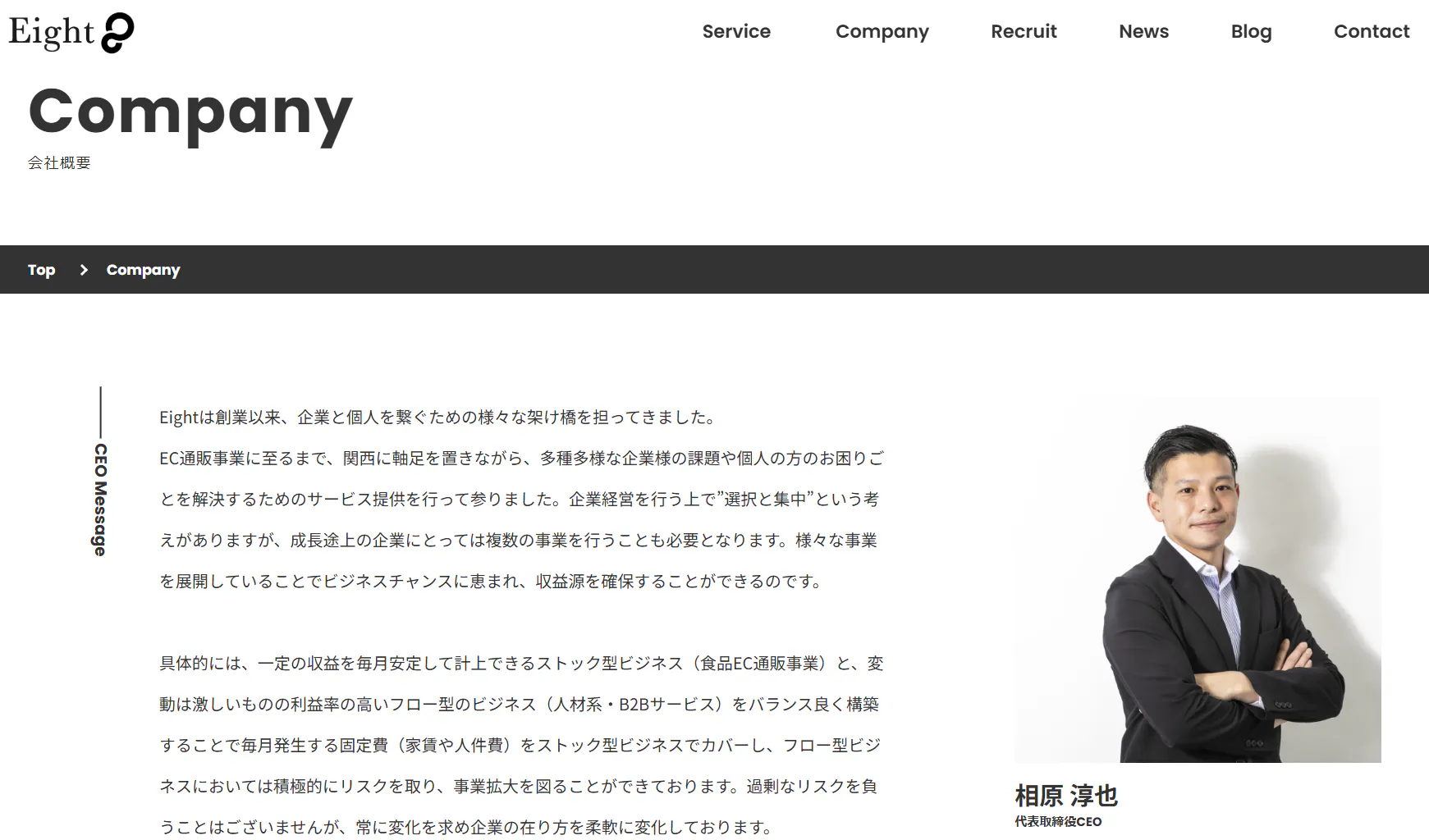 Eight株式会社は、関西を拠点に多彩な事業を展開する企業で、食品EC通販、人材サービス、SNSマーケティングなど、幅広い分野で活躍されています。