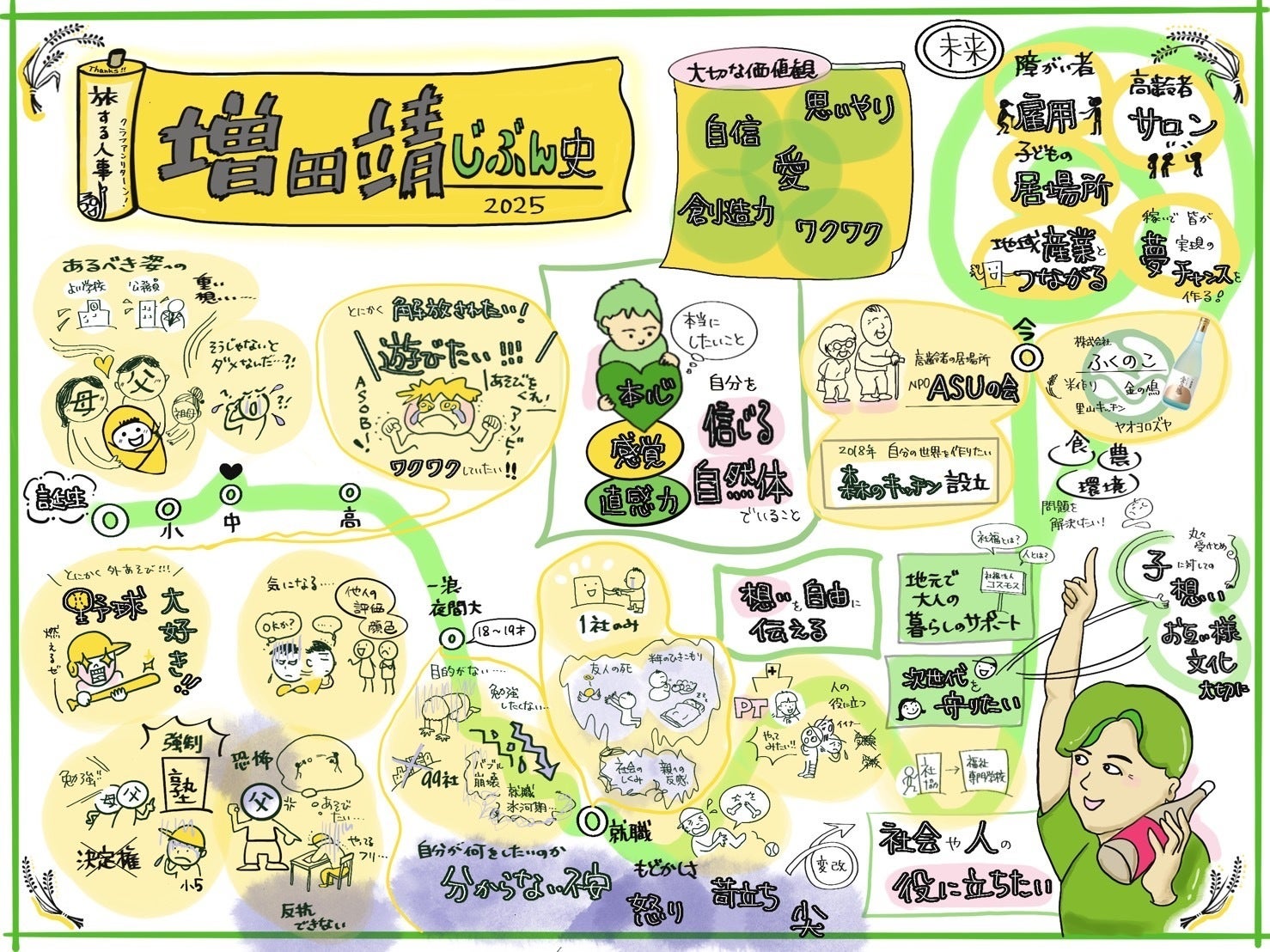 2025/02/04 21:45クラウドファンディングにて、「自分史をイラスト化」リターンを活用いただき、イラストが完成したのでご紹介です!▼リターンの内容はこちら「あなたの自分史を見える化!あなたのこれまでの人生をオンラインでお聞きしたものを録画し、デザイナーがグラフィックレコーディングで後日見える化したイラストを提供します。俯瞰的に自分を見ることで、新たな発見があるかもしれません」今回活用いただいたのは、株式会社ふくのこ 代表取締役の増田靖さん。株式会社ふくのこの代表以外にも、様々な肩書きを持つ増田さんのこれまでの生き方について、1時間ほどインタビューさせていただいた内容をグラフィックレコーディングという手法でイラスト化しました。イラスト化にご協力いただいたのは、お絵描き作業療法士の石本まゆかさん。幼少期から現在に至るまでのストーリーを丁寧に可視化していただきました。お披露目会を開催して、イラスト化する中での感じ方や表現について、描き手の石本さんから、依頼者の増田さんに直接フィードバック。「すごい!話した内容を絵にできるなんてすごいスキルですね。」と感動の声。「客観的に自分の人生を振り返ることができてありがたい。今後セミナーの自己紹介にも使いたい。」と、今後の活用方法のイメージについても感想をいただきました。さらに石本さんより、製作期間2ヶ月かけた作品ができる過程をなんと!30秒に短縮した倍速動画までプレゼントいただきました。▼作品の制作過程動画はこちらhttps://www.youtube.com/watch?v=0_c6XJsQjtsお絵描き作業療法士×旅する人事のコラボ企画リターン「自分史イラスト化」のご紹介でした。自分のキャリアを考える上で、これまでを振り返りながら、未来を描く。そんなきっかけにしてもらえたら嬉しいです。▼石本まゆかさんのinstagramはこちらhttps://www.instagram.com/oekakiot/▼増田靖さんの関連URLはこちら株式会社ふくのこhttps://fukunoko.net/社会福祉法人こだま福祉会https://www.kodamacco.net/八百萬屋 ヤオヨロズヤ(堺市南区槇塚台)https://www.instagram.com/yaoyorozu.ya/【純米吟醸】江戸時代創業、陸の今井の酒蔵「出世男」× 海の堺の復刻銘柄「金の鳩」https://camp-fire.jp/projects/401767/view「金の鳩」公式Instagramhttps://www.instagram.com/kin_no_hato/認定NPO法人ASOVIVAhttps://asovivaviva.org/堺市役所内の食堂「森のキッチン」障害者の自信を育み、笑顔とおいしいご飯があふれるレストランhttps://soar-world.com/2016/11/17/morinokitchen/ もっと見る