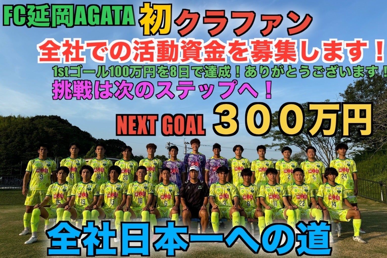 【100万円を8日間で見事達成!!】ファーストターゲットにしていました100万円を8日間で達成するという、FC延岡AGATAへの皆さまからの期待を感じました!皆さまのご支援・ご協力に本当に感謝しております。【ネクストターゲットを300万円に設定しました!!】当初は、メイン投稿にもありました〔6.達成への道のり〕で、100万円の次の目標を、200万円にしておりましたが、、、300万円に設定させて頂きました!!これは、ただの闇雲な目標設定ではありません。我々なら、この側から見たら一見、無謀だと思える数字への挑戦を達成し、選手たちを後押ししていきたいと思っています!!選手たちにも、全く想像のつかないJFL昇格へ向け、一歩づつ近づいて欲しい!!その一歩づつが、やがて、JFL昇格という目標へと繋がっていく!!目の前に見えるその時まで!!諦めずに!コツコツと!!一つ、ひとつの積み重ねが、大きなチカラを生んでくれることを、このクラウドファンディングを通じて、選手たちに伝えていきたいと思っています!!そして、AGATA FAMILYで一丸となり、まずは、全国社会人サッカー選手権大会で優勝を掴み取りましょう!!ご支援・ご協力を宜しくお願い致します。