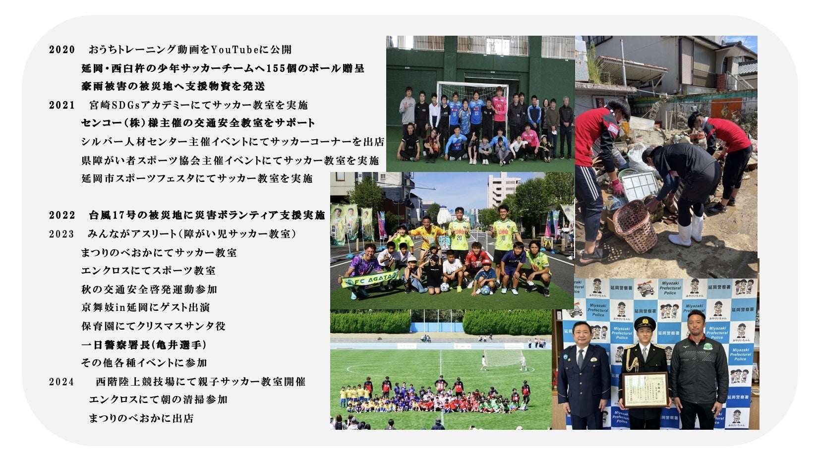2019年チーム創設時から今日までの5年余り、FC延岡AGATAが活動できたことは、ファン・サポーターをはじめパートナー、その他多くの皆様のご支援・ご声援・後押しがあってのことだと深く御礼申し上げます。