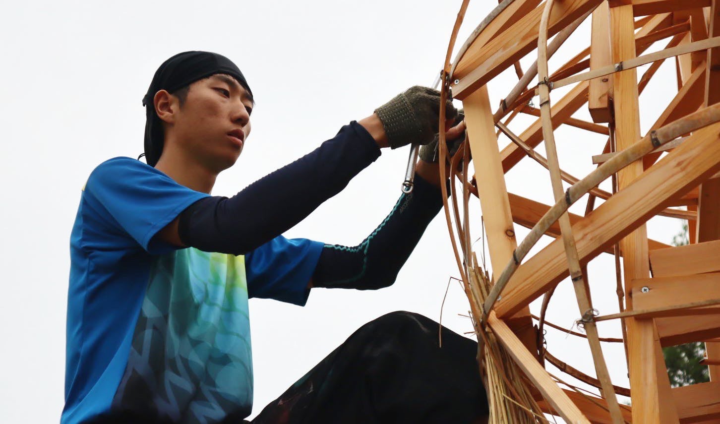 他大学は1体、私たちの大学は風神、雷神、大蛇、猫又の4体を高さ約3メートルで制作しました。