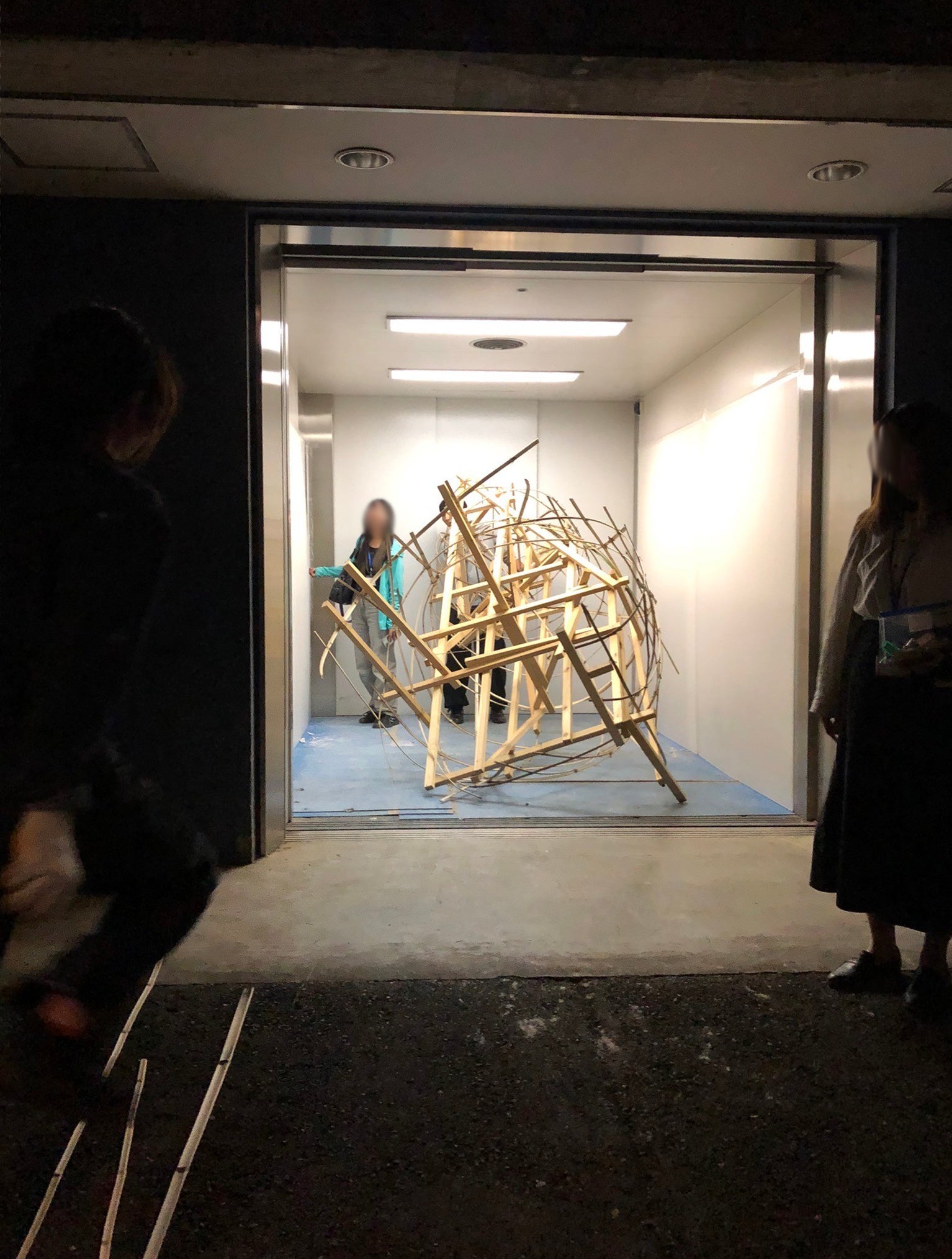 搬入用の巨大なエレベーターをお借りし、ねこを展示会場へ移動させていきます