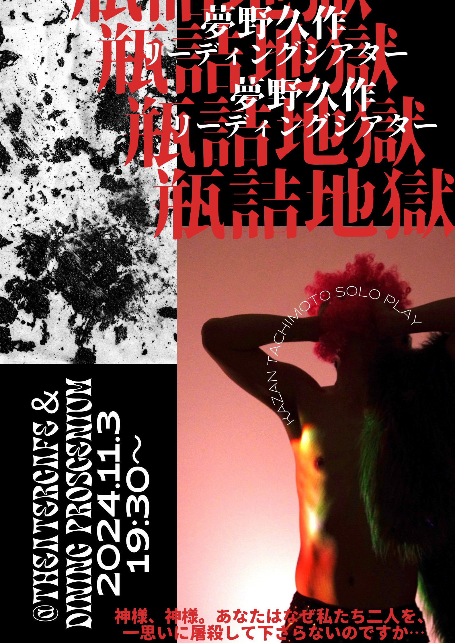 2024/10/21 12:4311月3日文化の日にクラファン感謝イベントを行います!夢野久作リーディングシアター『瓶詰地獄』と交流会!参加は無料です。俳優やパフォーマーは飛び込みパフォーマンス歓迎。高円寺で舞台や文化芸術について楽しく語り合いましょう!!ーーーーーーーーーーーーーーーーーーーー夢野久作リーディングシアター『瓶詰地獄』神様、神様。あなたはなぜ私たち二人を、一思いに屠殺して下さらないのですか…………。海難事故により遭難し、南国の小島に流れ着いた二人の兄妹。手荷物には聖書がひとつ。二人きりの世界で彼らが見た地獄とはなんだったのか。読者を幻魔境へと誘い込む、夢野久作の代表的な書簡体小説を一夜限りのリーディングシアターとして上演。原作:夢野久作構成・演出・出演:立本夏山日時 2024年11月3日(日) 18:00open/19:30start料金 無料(カンパ制・ドリンク代別)※クラウドファンディング応援感謝企画として、パフォーマンスの前後は交流会になります。「瓶詰地獄」は20分程度の作品です。俳優、パフォーマーの皆さんは飛び込みパフォーマンス歓迎します。※予約不要(当日人数把握のため、いらっしゃる場合一言メッセージいただけると助かります。) お問い合わせ mail@kazan-office.com会場 TheaterCafe&Dining Proscenium 高円寺駅南口から徒歩3分 東京都杉並区高円寺南3-46-9 B1F もっと見る