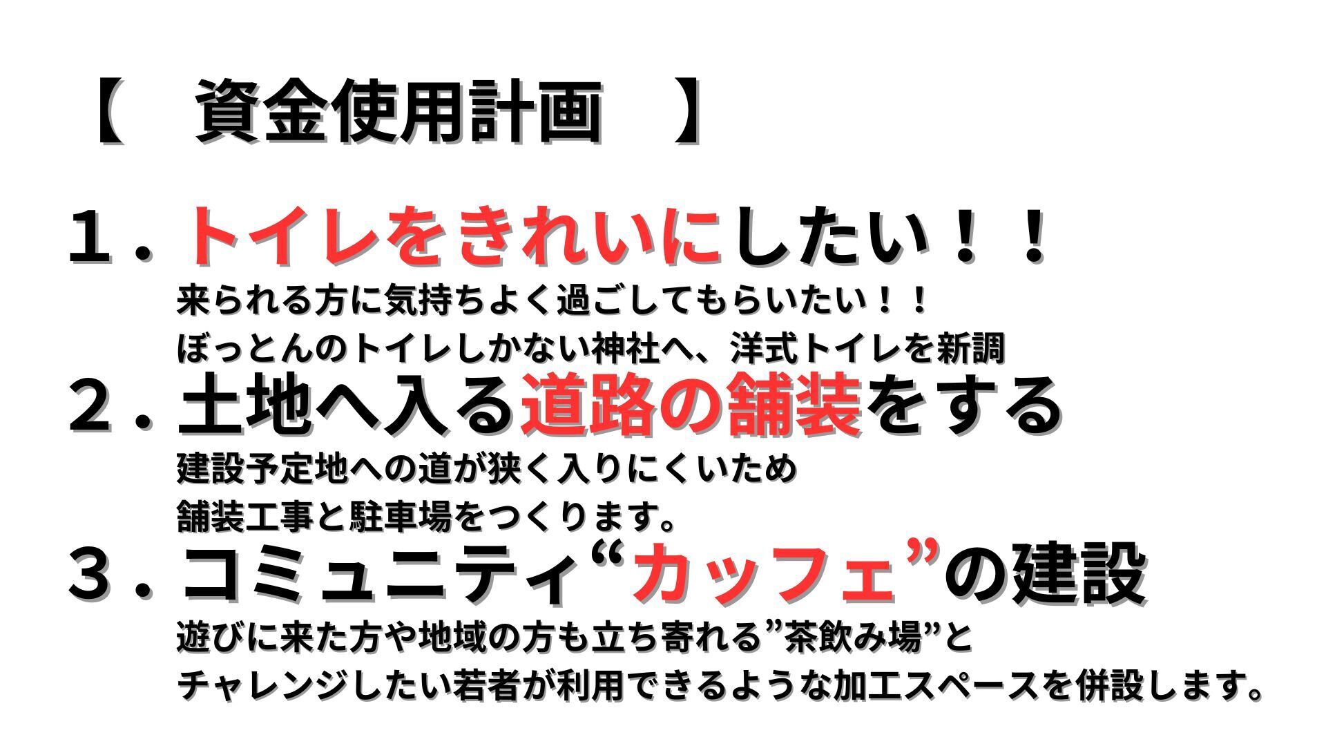 2025/02/01 09:30この度はたくさんの方からのご支援と応援を頂き誠にありがとうございました!!残念ながら、300万円を達成することはできませんでしたが、カッフェ建設に向けて引き続き支援を募っています。終了後でも、個人様企業様からのご支援受け付けておりますので、どうぞよろしくお願い致します。早速第一弾リターン返送がはじまります!!まずは、七滝みそ(2月発送分)の準備に取り掛かりたいと思います!!どうぞよろしくお願い致します。 もっと見る