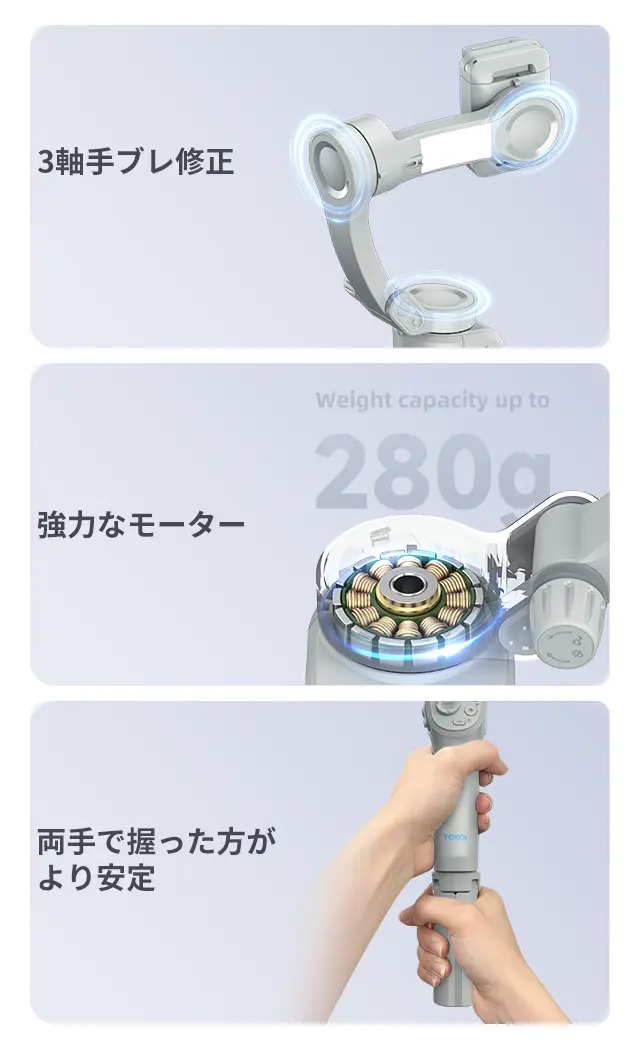 「TOKQI-M1」には3軸スマートスタビリティシステムが内蔵されており、運動中で角度を連続的に調整することで、動画を常にスムーズで安定した状態に保ちます。