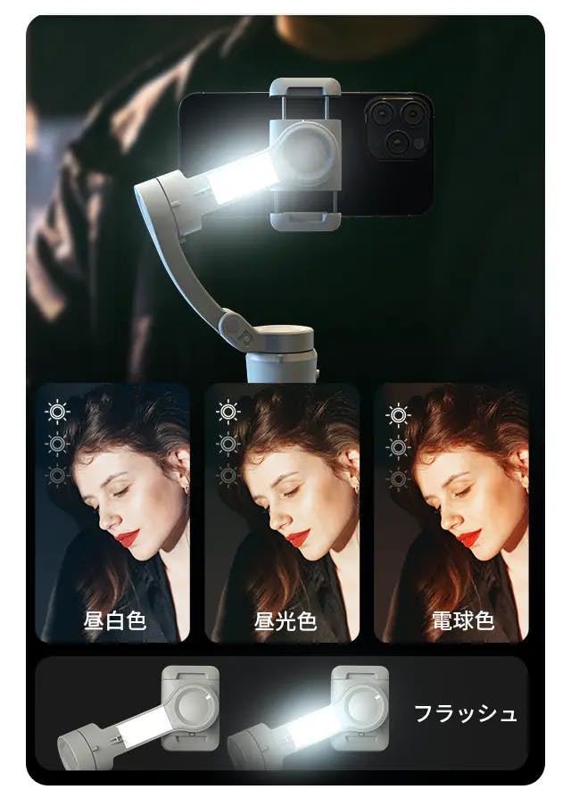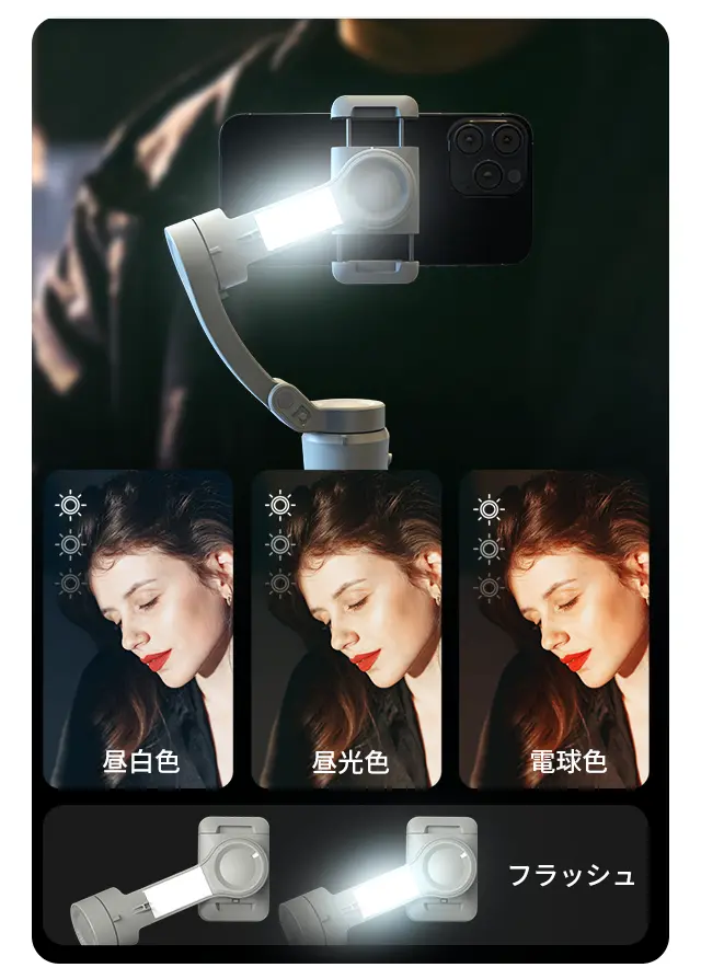 「TOKQI-M1」の補光ランプボタンをダブルクリックするとフラッシュモード。1回クリックすると3色9段の色温度が調整することができます。