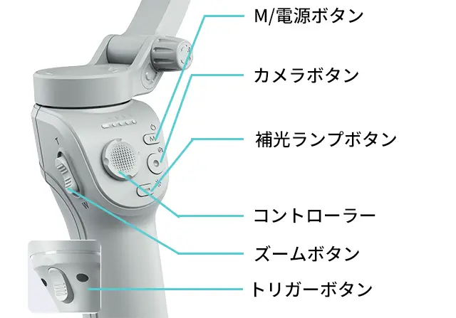 「TOKQI-M1」のハンドルには、撮影操作に必要なボタンがレイアウトされています。ジンバルやカメラを片手で簡単に操作可能です。