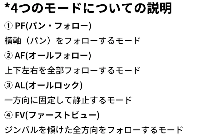 3軸ジンバルの3軸は、パン(水平・左右)、チルト(垂直・上下)、ロール(回転)の3つになります。軸が多いほど、ブレのないきれいな動画の撮影ができます。
