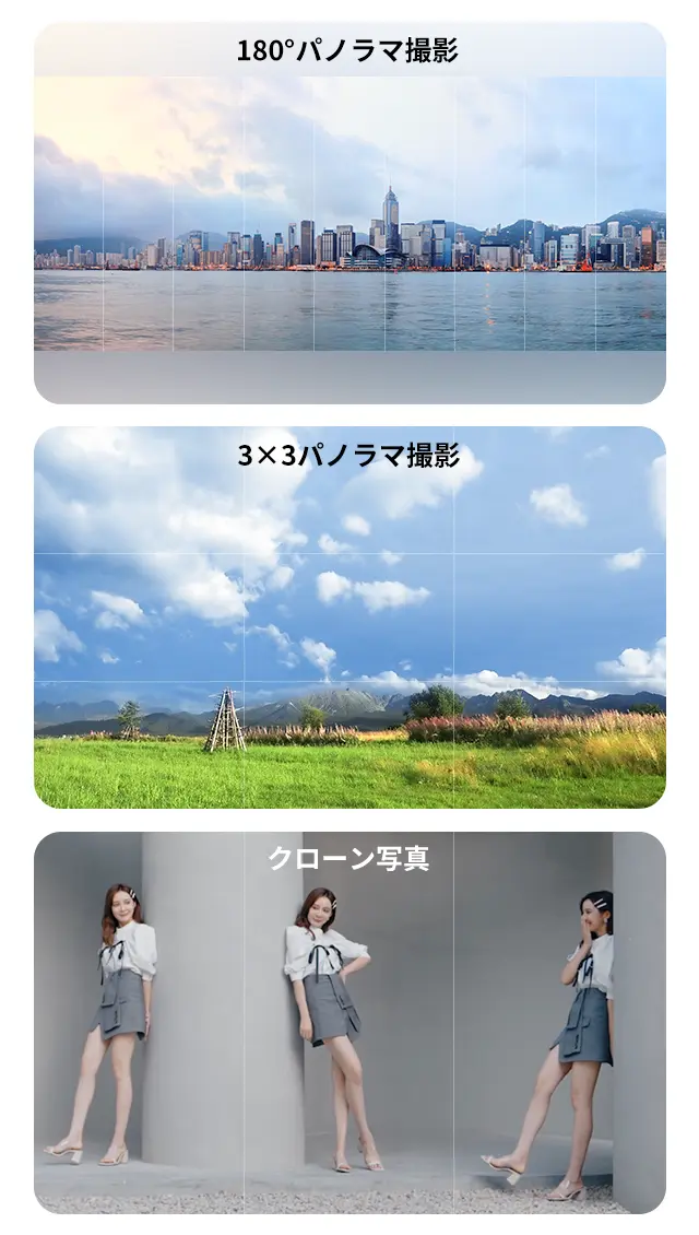 ジンバルが180°、または330°自動で横回転して風景を連写。撮影した写真からアプリが自動でパノラマ画像を生成し、通常の撮影では撮れないようなワイドな画角を楽しむことができます。