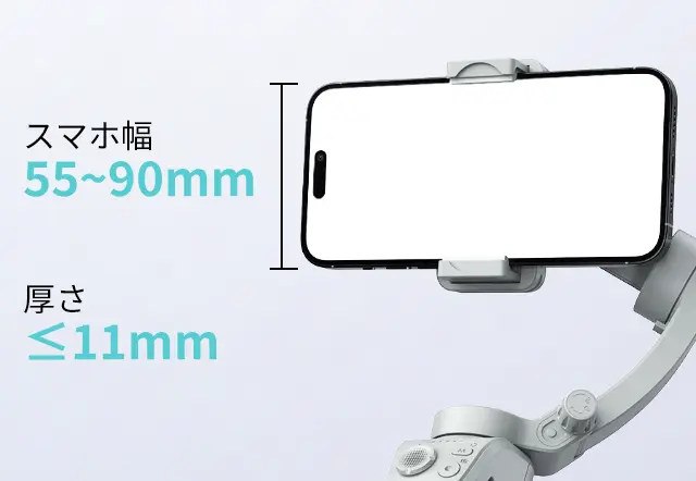 A:横:55-90mm・縦:≤11mm。市販のほとんどのスマホに対応しています。