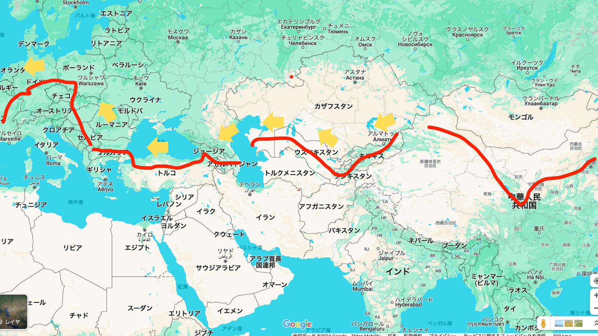 前置きさせていただきましたが、今回はシルクロードの中でもカザフスタンのアルマトイからフランスのパリまで走ります。