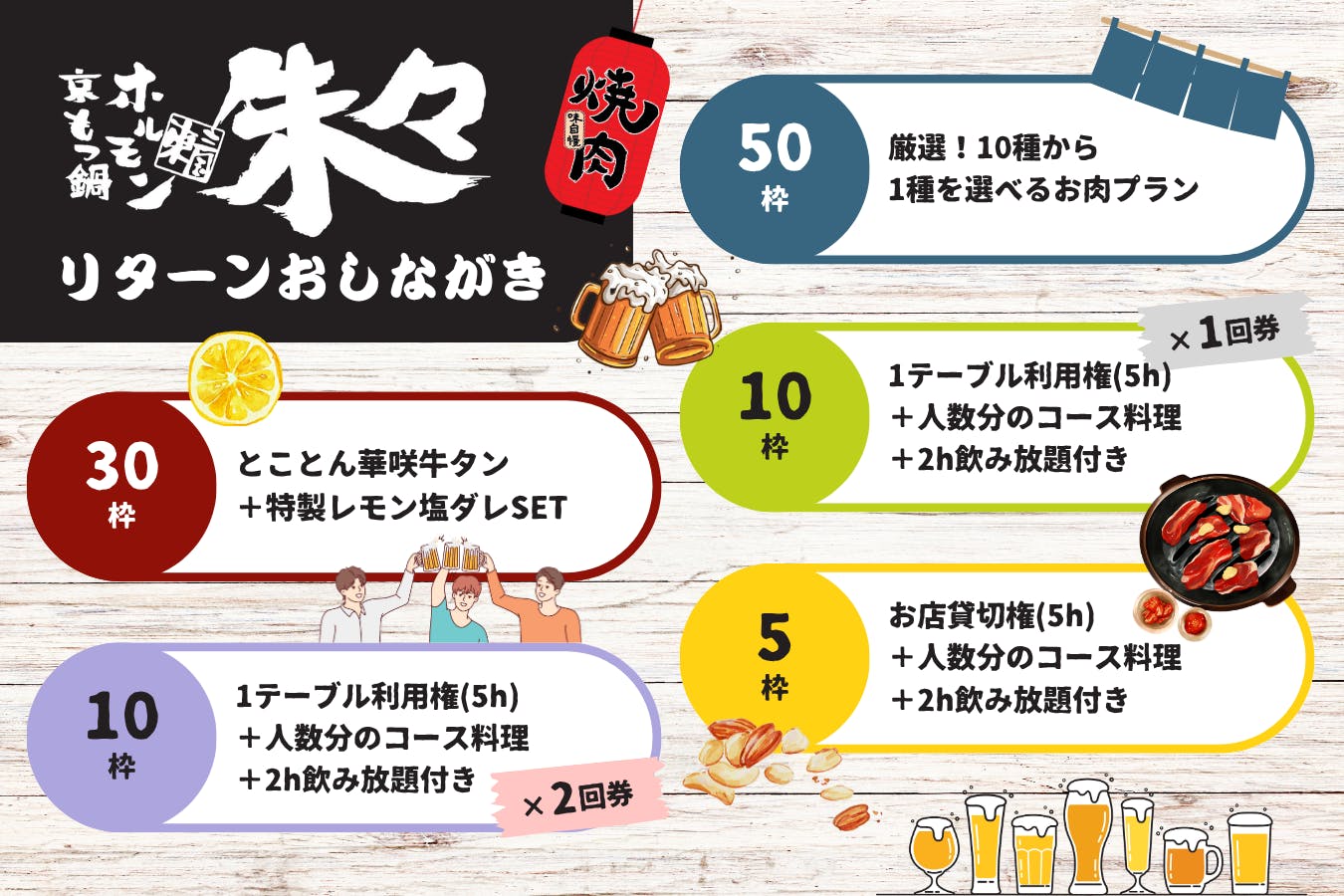 今回のリターン品以外にも、お店では特製もつ鍋やホルモンなど当店自慢のメニューがまだまだありますので、ぜひご来店をお待ちしております!