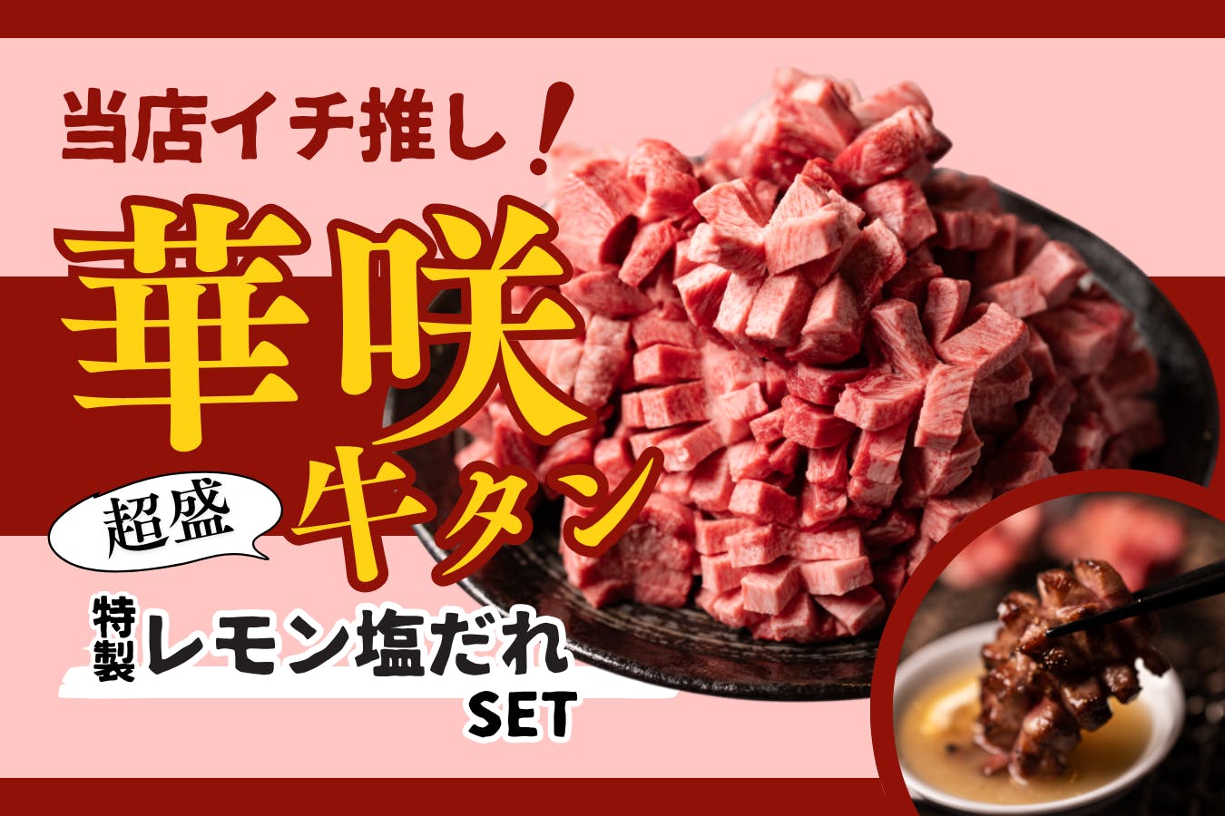 当店で圧倒的人気を誇る華咲牛タンと当店特製のレモン塩ダレのセットをお届けします。
