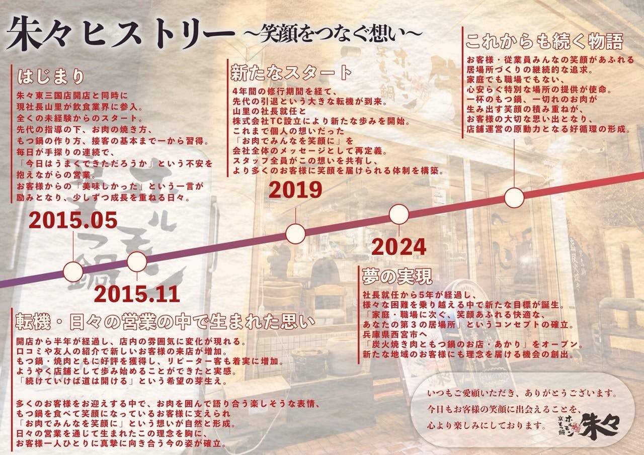 大阪で『京もつ鍋ホルモン朱々東三国店』、兵庫県で『炭火焼肉ともつ鍋のお店あかり』 を経営している株式会社TC<Third Community>です!