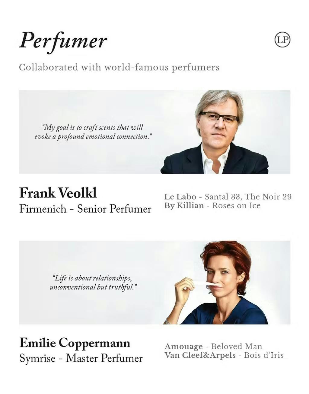 調香したFrank Veoklとアムアージュ(Amouage)の「ビーラヴドマン」、「ヴァンクリーフ&アーペル」の調香士Emilie Coppermannが調香に参加しました。