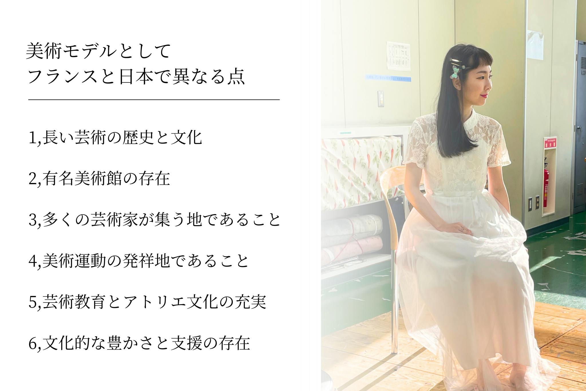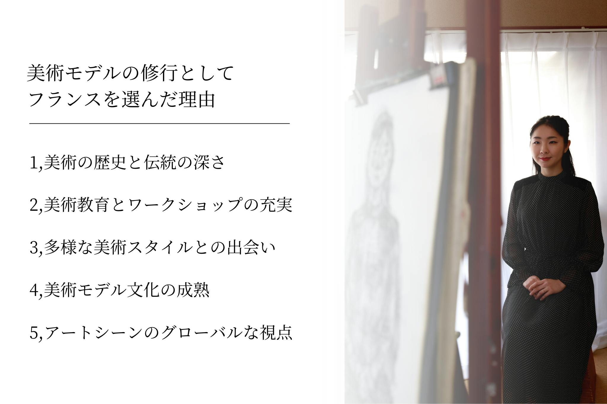 『芸術の都パリ』と総称されるように、フランスは芸術が生活の一部となっており、先進的な美術教育や世界的にも著名なアーティストや作品が集まる場所として発展しています。日本人美術モデルとしての良さや魅力を、フランスの芸術文化に触れることによって、さらに引き立てられると考えております。